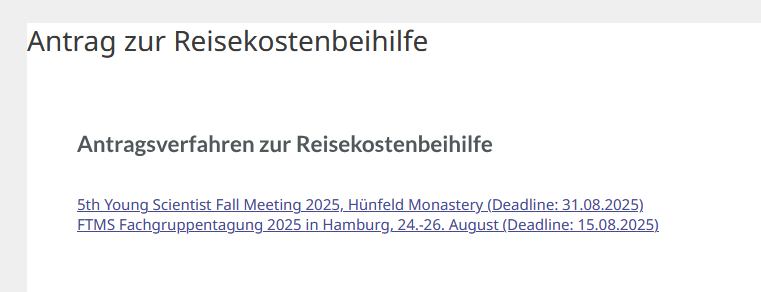You have to switch to the german version of the website, then it will show up a link at the bottom labelled “Online-Antrag zur Reisekostenbeihilfe (Login notwendig)” [translation: Online-form for travel grants (login required)]. This directs to a second page, where you have to choose the correct event: “5th Young Scientist Fall Meeting 2025, Hünfeld Monastery (Deadline 31.08.2025)”. Clicking on this will get you to the correct form to fill out (see image below).